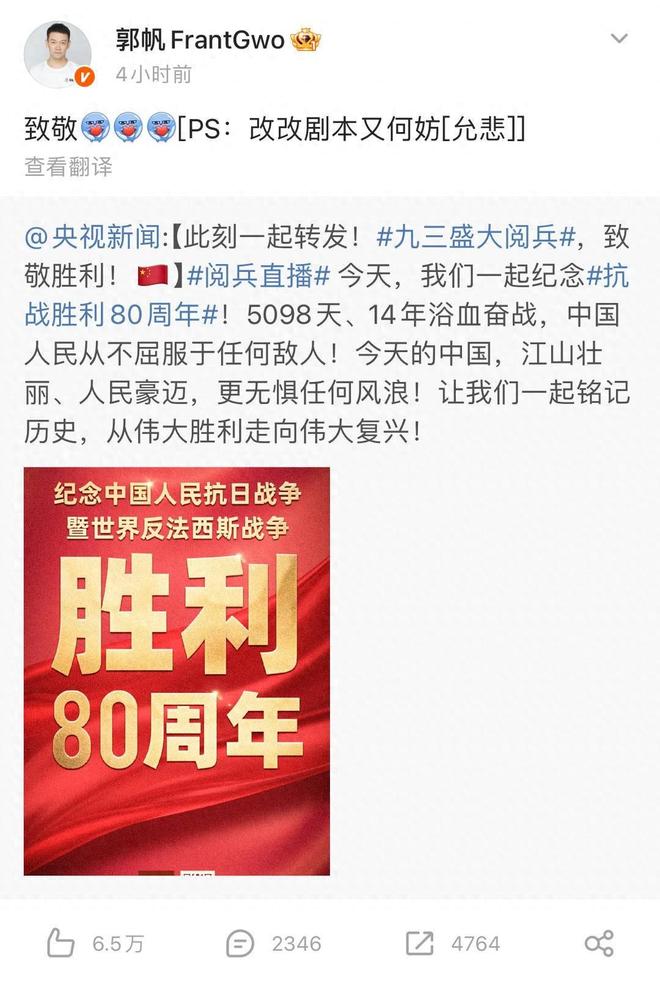 今天早上,在北京举行了一场纪念中国战争方法对日本入侵和世界反法西斯战争的胜利80周年的军事游行。在观看了“流浪地球”系列之后,一位Guo迷在社交平台上发布了一条消息,“致敬,PS:为什么不更改脚本?”然后,“ Guo Fan脚本更改”成为热门搜索。观看了军事游行之后,郭球迷在社交平台上发布了一篇文章,即科幻电影《流浪地球》系列在社交平台上发行。第一个发行于2019年。故事定于2075年。它讲述了即将崩溃的那一天的故事。破坏后的太阳系不再适合人体安全。面对绝望的情况,人们将启动“徘徊地球”的计划,试图挑选世界以逃离太阳系并找到人类的新家,并最终在票房赚取46.88亿元人民币。 “流浪地球2”是它于2023年发行。它讲述了“太阳危机”即将到来的故事,世界陷入了恐慌,一万个行星的机器正在建设中,人们将面临世界末日和生存的两个灾难灾难挑战。最后的票房是404.3亿元人民币。 “流浪地球3”一直在拍摄拍摄,并分为上下部分,讲述了结束的一天的故事,人们在世界范围内建造了大型推进器,以找到新家。但是,通往宇宙的方式充满了风险。为了拯救世界并允许人们到新家2500年,年轻人在世界各地徘徊并开始了一场生死之战与时间。据报道,上部将在2027年的第一个新年农历日发行。当《徘徊地球》的前两部电影发行时,硬核高科技电影设备引起了整个互联网上的热烈讨论。尤其是当“ WA中国航空航天科学技术公司发行了ndering Earth 2“,也宣布开发2017年至2045年的太空运输系统路线图,并说楼梯,土地站和太空站将在2045年成为现实。在2045年,中国核心公司,国家建筑,Sinopec和China Mobiaring of Dreams of Dreams of Dreams in in in of Dreams in in in in in in of。今天早上,包括军事航空部队的三名新士兵,网络空间部队和信息团队的首次亮相,同时展示了许多高级设备,例如反uav的系统和空气无人驾驶战斗开玩笑说:“导演Guo粉丝很高兴“友好地提醒您,在发行前只剩521天。 Kong Association和Olympic委员会主席Huo Zhenting于9月2日到达北京,参加了9月3日举行的军事游行。为了参加重大的国家活动,并强调每次参加军事游行时,他都可以目睹中国军事的飞跃在他自己的眼中,设备,城市发展和全面的力量。他特别提到:“目前与他的两个Anak na lalaki,Ito Ay Isang Kaluwalhatian para sa para sa pamilya na lumahok sa Grand活动。” Noong Hapon ng setyembre 3,nag -post si huo qigang ng isang mahabang artikulo upang ibahagi ibahagi ang kanyang kanyang kananasan karanasan sa panonood panonood panonood ng parada ng militar。 Ang buong teksto ay ang mga sumusunod: Nag -post si Huo Qigang ng isang screenshot at pinarangalan na dumating sa Beijing upang dumalo sa parada ng militar nang personal sa mahalagang sandali ng ika -80 anibersaryo ng tagumpay ng War against Japan I was born in the late 1970s, and it was a happy time without war在与日本战争中,军事的发展,每个排,盛大的武器和先进武器的适当运动以及退伍军人的发展,他们感谢SA ME和感谢。我们目前的稳定生活和全球和平是基于中国人在与JA斗争的战争中做出的巨大牺牲潘80年前。在该国的强大保护下,我们必须记住历史,所有这些都很难失去!如今,世界正在发生重大变化,这是一个世纪以来没有看到的。如何保护勤奋的和平是世界各地需要填补的答案。习近平总统最近提出了一项全球管理倡议,以及反思性演讲中的逻辑,该逻辑强调了当今宝贵的讲话,遵循和平发展,追求主权和平等的道路,并与所有国家的人民合作,以发展一个未来的未来Futureatauhan的社区。在实施过程中,强大的军队向我们展示了我们信心的世界,并为保存国家主权,团结提供了重要的战略支持,实现了对中国国家甚至世界和平的巨大刺激。看着未来,建立一个具有共同未来的人类的社区需要民间交流。我相信该体育将成为文化融合的平台,并建立民族传播的桥梁,取代战场的比赛,团结人们的心,并为全球和平发展做出贡献! Ho Kit-gang拍摄了军事游行现场的照片